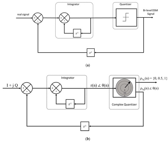 In this work, we used the CxDSM, as it presents a higher coding efficiency and reduces the power of the quantization noise [3]. The CxDSM in Figure 1b was first presented in [8,9], and is based on simultaneous quantization of the in-phase component (I) and the quadrature-phase component (Q) of a complex signal. This technique exhibits more accurate quantization of the signal, resulting in higher coding efficiency and linearity than its Cartesian DSM (CDSM) counterpart [3].