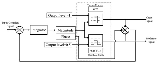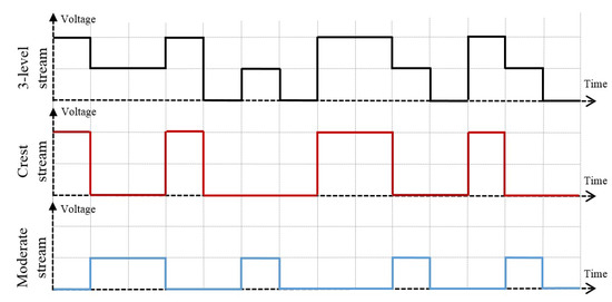 The Moderate stream and the Crest stream are generated by two separate transmitters. In order to perform the de-multiplexing process, the three-level DSM circuit is decomposed into two separate quantization circuits, as shown in Figure 3; the Moderate quantizer outputs a signal with a level of a 0.5 whenever the signal lies in between the thresholds 0.25 and 0.75; otherwise, the output is zero. Similarly, the Crest quantizer generates the ones signal every time the signal exceeds the threshold of 0.75; and otherwise, zeros.