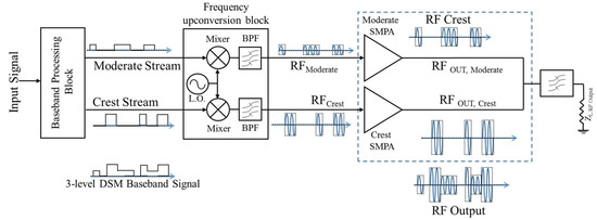 The output signal of the DSM circuit is split into two bi-level streams, Crest and Moderate streams. Hence, two constant envelope RF signals are generated, the two baseband streams are frequency up-converted by mixing them with the desired RF carrier frequency.
