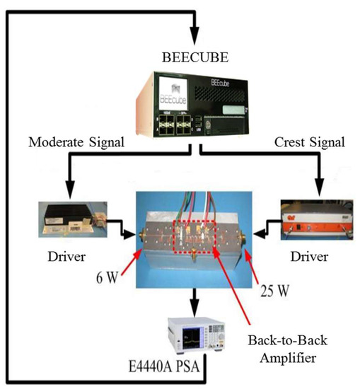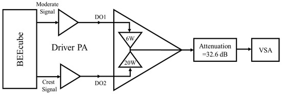 The setup of the de-multiplexed DSM shown in Figure 6 is composed of the BEEcube™, the driver PAs, the amplification block, and the spectrum analyzer. A triggering signal is needed between the BEEcube™ and the PSA spectrum analyzer.