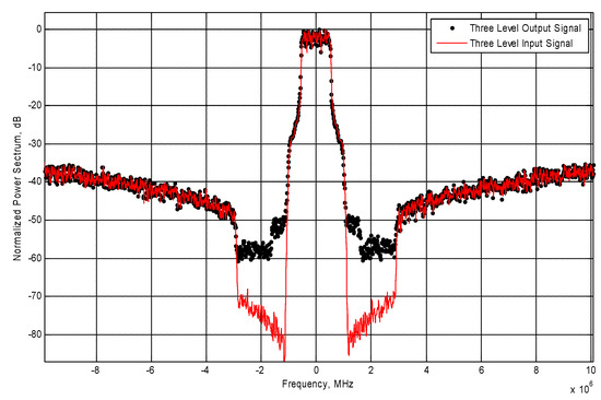 The measured difference between the output powers of the Crest SMPA and the Moderate SMPA is equal to 5.3 dB lower than 6 dB. Thus, the linearity of the transmitter is degraded when driven with a three-level quantized signals with 1, 0.5, and 0 levels.