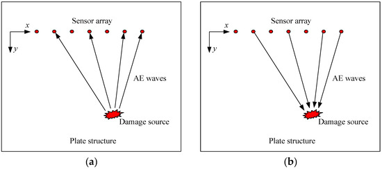 Traditional AE source localization methods are based on signal processing. Most of these localization algorithms developed utilize time information extracted from the AE wave signals recorded by different sensors. Combined with the known velocity of AE waves and the distance between the sensors, the location of the AE source can be triangulated or calculated by solving a set of nonlinear equations [3,4,5,6,7,8]. The time information is usually extracted by relatively simple processing methods, such as threshold crossing [9], cross-correlation [10] and statistical Akaike information criterion (AIC) [11,12]. Recently, with the development of time-frequency signal processing, the continuous wavelet transform (CWT) has been widely used for the time-frequency representation of transient AE waves and extraction of useful time information at each local frequency for AE source localization [4,5,13,14]. Besides, other advanced signal processing techniques, such as warped Fourier transform (WFT) [15], Hilbert transform (HT) [16], short time Fourier transform (STFT) [17], have been also employed for processing the AE wave signals. In addition, probabilistic and statistical approaches, which can characterize the AE source with consideration of various uncertainties, in particular uncertainties in extracted time information and wave velocities, have received more and more attention in AE source identification. These approaches includes extended Kalman filter (EKF) [18], unscented Kalman filter (UKF) [15], particle filter (PF) [19] and Bayesian methods which are realized by Monte Carlo simulations [20,21,22]. In addition, machine learning approaches, such as artificial neural network (ANN) and support vector machine (SVM), have also been employed for AE source localization [23,24,25,26]. Results have demonstrated that ANN and SVM are promising ways to localize AE sources; however, they require a large amount of data sets for training, impeding their applications in practical use. Another big problem for these aforementioned signal processing-based approaches is that, since the AE wave signals generated by multiple simultaneous AE events are difficult to be clearly separated, the developed localization methods mentioned above lack the capability to identify the locations of multiple simultaneous AE events.