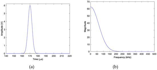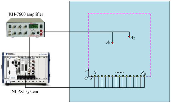 Experimental studies on an aluminum plate are conducted to verify the effectiveness of the proposed method. The experimental set-up comprises an aluminum plate and a National Instrument PXI system incorporated with a PXI-5441 signal generator and two PXI-5105 digitizers and a KH-7600 amplifier. The aluminum plate has dimensions of 1000 mm × 1000 mm × 2 mm and its nominal properties are as follows: elastic modulus = 73 GPa, Poisson ratio = 0.32 and density = 2790 kg/m3. A linear sensor array containing 15 PZT transducers, denoted by S1 to S15, with thickness of 1 mm and diameter of 10 mm are mounted on the surface of the plate. These sensors are connected to the data acquisition channels of the digitizers to monitor the damage events and collect the AE wave signals. Unfortunately, S4, S12 and S13 malfunction in the later test, so only the 12 normal sensors are used for damage imaging. Another 2 PZT transducers with the same size and material, denoted by A1 and A2, are also mounted on the surface of the plate to act as actuators to excite AE waves to simulate the damage events. The aluminum plate and sensor placement is illustrated in Figure 3 (not in scale). The origin of the Cartesian coordinate system is set at the left of S1, with distance of 75 mm. The coordinates of the center locations of sensors S1 and S15 are (75, 0) mm and (425, 0) mm, respectively. The remaining 13 sensors are uniformly distributed between S1 and S15 with spacing of 25 mm. The coordinates of the center locations of actuators A1 and A2 are (190, 250) mm and (295, 300) mm, respectively. During the experiment, a wideband impulse excitation as shown in Figure 4 is generated by the signal generator, amplified by the amplifier and applied the actuators to simulate the burst of AE event. The amplitude of the signal output by the signal generator is 6 V and the gain of the amplifier is 28 dB. The simulated AE waves are then received by the PZT sensor array and recorded by the digitizers with a sampling rate of 10 MHz.