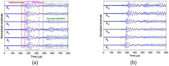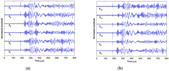 Simulated AE wave signals in case II: (a) sensors S1–S7 (b) sensors S8–S15.