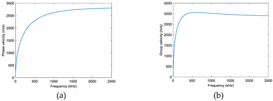 Dispersion curves of fundamental flexural wave by Mindlin plate theory: (a) phase velocity (b) group velocity.