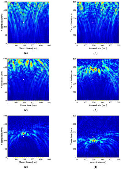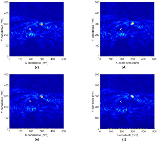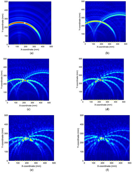 Optimal image for identification of consequent damage sources with different delays with synthetic data: (a) 10 µs delay (b) 15 µs delay (c) 20 µs delay (d) 25 µs delay (e) 30 µs delay (f) 35 µs delay.