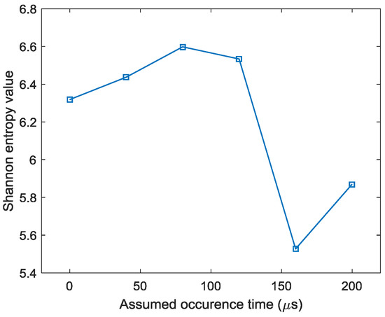 The imaging condition used in the reverse-time f-k migration in Section 2 assumes that the start point of the recorded AE wave signals is exact the occurrence time of the AE events. Nonetheless, in real applications, the occurrence time of the AE events is usually unknown and cannot be determined directly from the AE wave signals recorded by the sensor array. This means that the AE waves may not be back-propagated to their exact source locations by migration if the signal length of the AE waves is not consistent with the right occurrence time. Thus, an important problem should be solved for applying the reverse-time f-k migration method is to determine the occurrence time and the image contains information of the source locations that mostly approximates the actual ones. Derveaux et al. proposed an optimal method with a time-reversal technique to determine the time when the time-reversed wavefield can focus on the damages [33]. The basic idea of their study is employed in this study, an optimal criterion using minimum entropy principle is adopted to achieve the objective.