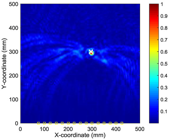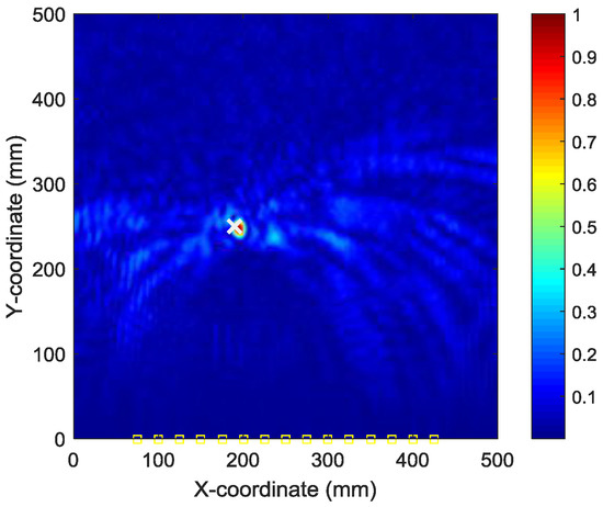 To find the optimal image with the identified damage locations and occurrence time mostly approximating the actual ones, the ABC algorithm combined with the optimal criterion using minimum Shannon entropy described in Section 3 is applied. The number of populations in the ABC algorithm is set as 20 and the initial values of the occurrence time are randomly generated between 30 µs and 230 µs. Figure 9 shows the objective value (Shannon entropy value) evolution curve and the occurrence time evolution curve in ABC algorithm for case I. It can be found from Figure 9 that the entropy value reaches an optimal minimum with identified occurrence time of 178.7 µs (the actual one is 160 µs) and the Shannon entropy value of the optimal image is 4.877. Figure 10 shows the optimal damage image with the identified damage location indicated by the highest pixel value in case I. The actual simulated damage location is also highlighted by a ‘X’ mark for the purpose of comparison. From the figure, it can be clearly seen that combined with the optimal image criterion, the reverse-time f-k migration successfully reversed the AE waves back to its damage source. The identified location with coordinates of (197.5, 241.7) mm agrees very well with the actual one; the deviation is less than 11.2 mm (about 2.2% compared to the side length of 500 mm of the image area), demonstrating that the proposed method has the capability of imaging single damage event. The error between the identified and the actual occurrence time is because of the uncertainty of the material properties and the finite size of the actuators and sensors (they are not ideal points as assumed in the algorithms).