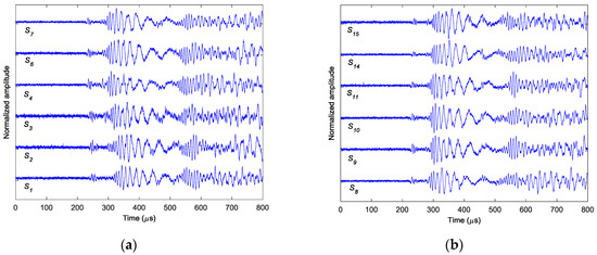 Simulated AE wave signals in case I: (a) sensors S1–S7 (b) sensors S8–S15.