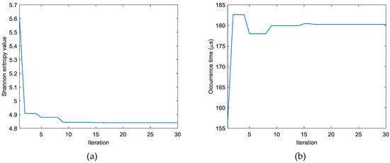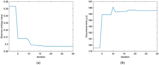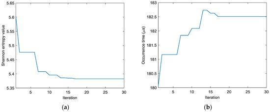 Evolution curves of results by ABC algorithm in case II: (a) Shannon entropy value (b) Occurrence time.