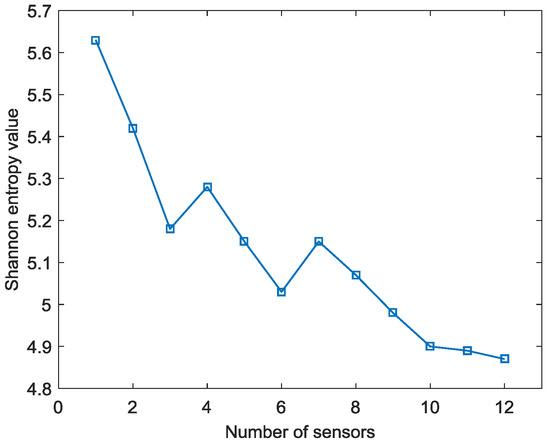 To further explore the proposed method, firstly the effect of sensor number on the imaging results has been studied. Taking case I as an example, Figure 17 shows images generated by f-k migration with AE wave signals collected from different number of sensors. For generating these images, the identified occurrence time of 178.7 µs is taken as the start point of the AE wave signals. It can be seen from the figures that, when only one sensor’s signal is back-propagated and imaged by f-k migration, it forms a circle with the sensor as its center on the image (as shown in Figure 17a); when signals from two sensors are employed, the intersection point of the two circles is considered as the identified AE source location (as shown in Figure 17b). The more sensors are used, the clearer the intersection point is (as shown in Figure 17c–f) (this means that it is easier to identify the damage locations from the image generated by f-k migration). Figure 18 shows the variation of entropy values of images with the number of sensors used for providing AE wave data for migration for case I. From the trend of the curve, it can be seen that in general, with the increase of sensors, the entropy value decreases, meaning the obtained image has sharper peaks near the actual source locations.