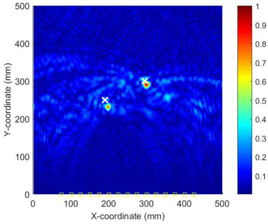 Optimal image for identification of consequent damage sources with delay of 5 µs with synthetic data.
