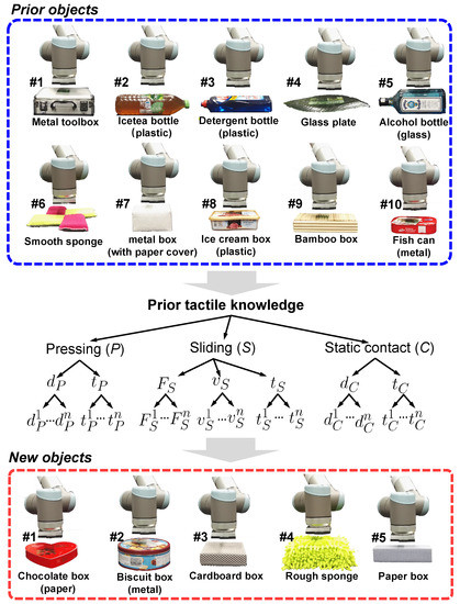 Over the past decades, researchers have developed various tactile sensors and mounted them on robotic systems (e.g., [11,12,13,14,15,16,17]). In this way, the robots with a sense of touch can perceive different objects’ tactual properties by applying exploratory actions. For example, a robot can slide its sensory parts on objects to sense their textural properties [18,19,20,21], establish a static contact to estimate the temperature [22], or lift objects to measure their center of mass [23]. Bhattacharjee et al. [24] developed algorithms to classify objects into four categories: (1) Hard-Unmoved; (2) Hard-Moved; (3) Soft-Unmoved; and (4) Soft-Moved using One Nearest Neighbor Classifier, Hidden Markov Models and Long Short Term Memory networks based on features of time-varying tactile sensor data (maximum force, contact area, and contact motion). Furthermore, several methods have been proposed for the active object exploration problem, in which the robot actively applies multiple exploratory actions to recognize objects (e.g., [25,26,27,28,29,30,31,32]).