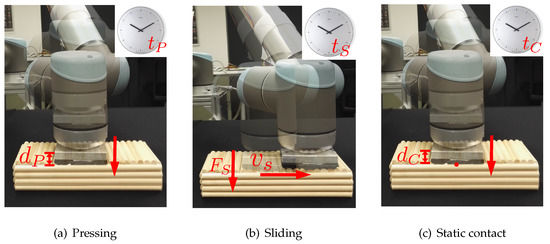 The object thermal cues can be attained by the robotic system by applying static contact movement: the robot presses its sensory part against the object surface until a depth of and maintains the contact for seconds, i.e., (see Figure 3c). The normal force feedbacks and temperature feedbacks are recorded: , .
