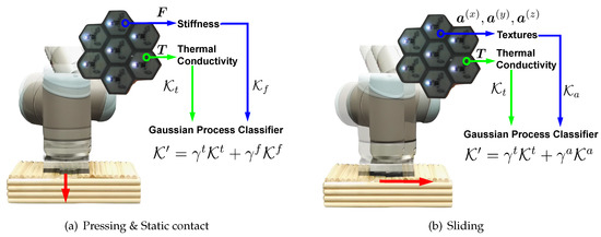 In order to combine the observations perceived from different tactile sensors, we first define as the feature observation of an exploratory action . It is comprised of multiple observations: , where is an observation from the sensor modality , is the number of sensing modalities. For the pressing and static contact movements, we use the normal force and temperature sensing, for the sliding movement the accelerometer and temperature sensing (Table 2). Then, we assume that for a sensor modality , a kernel function is given. To combine multiple feature observations so as to exploit the information from all sensors after applying the exploratory action , we linearly combine the kernels: