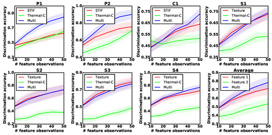 Multiple feature observations combination results for exploratory actions , , , , , , and the averaged result. STIF: building the GPC observation model based on object stiffness; Thermal-C: thermal conductivity; Texture: object surface textural properties; Multi: combined feature observations. The horizontal axis represents the number of feature observations. The vertical axis represents the discrimination accuracy of the test dataset.