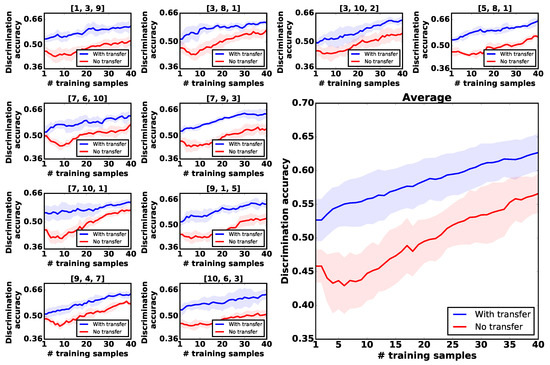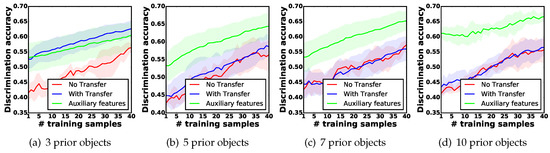We randomly shuffled the prior objects into ten groups following a uniform distribution. Each group consisted of the feature observations and the observation models from three prior objects. We conducted the experiment with five trials for each group. In each trial, the robot followed the transfer learning approach and no-transfer approach to collect 40 feature observations in total, allowing a fair comparison between different learning strategies to be made. Figure 7 illustrates that with the help of prior knowledge, the robot consistently outperformed the learning process without prior knowledge with a discrimination accuracy of .