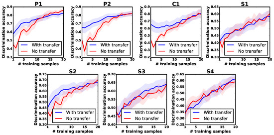 In order to further evaluate the robustness of APTKT, the robot was then tasked to learn about objects via applying only one of the exploratory actions. The experimental procedure was the same as the one described above. As the results in Figure 8 show, The robot had a larger improvement by actions P1, P2 and C1 than actions S1, S2, S3 and S4. For example, the robot increased the discrimination accuracy by , when it reused the prior tactile instance knowledge from the movement P2. However, when learning about objects by actions S1 and S4, little improvement was seen. This was due to the fact that different exploratory actions produced different object feature observations. For action P2, there existed higher related prior tactile knowledge than S1 and S4, and the robot could benefit more on it.