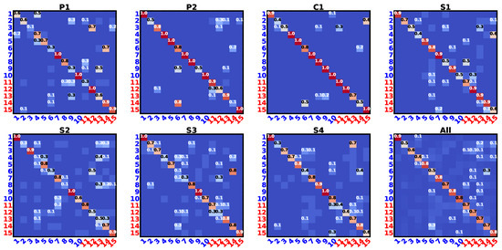In order to evaluate our proposed transfer learning method (APTKT) against the negative tactile knowledge transfer, we deliberately selected irrelevant prior objects and compared the transfer learning performance with the baseline method, following the same experimental process described in Section 5.4. When finding which objects were relevant (or irrelevant) to each other, we built object confusion matrices to roughly evaluate the object similarity. For each of the seven exploratory actions, we trained a Gaussian Mixture Model (GMM) and calculated the object confusion matrix. To do this, we first used GMM to cluster all the samples from the dataset with the hyper-parameters optimized by the Expectation-Maximization (EM) algorithm. The number of clusters was set to be the same as the number of objects (in our case, 15), and each cluster centroid was initialized as the mean value of all data samples that belonged to an object. The maximum EM iterations was set to be 100, with convergence threshold being . We further calculated the confusion matrix averaged over all exploratory actions. These matrices indicated the averaged similarity between objects. We rescaled their values to be within 0-1, with 0 meaning that two objects are totally dissimilar, and 1 the same. The objects which had low similarity values with target objects were selected as irrelevant objects. The results are shown in Figure 10. According to Figure 10, prior objects {1, 5, 7} (objects {1–10}) were dissimilar to the new objects (objects {11–15}) regarding the exploratory movement P1, objects {1, 4, 7} for P2, objects {4, 7, 10} for C1, objects {1, 6, 9} for S1, objects {1, 7, 10} for S2, objects {1, 3, 9} for S3, and objects {1, 3, 8} for S4. We thus used these objects as prior objects to test the transfer learning performance via the single exploratory action. We further selected objects {1, 5, 10} to test the learning process via all exploratory actions, since these three objects shared relative small similarity to the new objects.