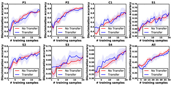 In all scenarios, using our proposed transfer learning algorithm, the robot could achieve a higher discrimination accuracy than the baseline method with the same number of feature observations. Therefore, we can conclude that APTKT helps the robot build reliable observation models of new objects with fewer training samples, even when only one kind of exploratory action is applied.