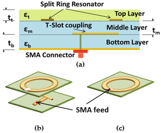 (a) Side view of the proposed multilayer sensor. The bottom layer consists of TMM4 substrate and the ground plane, the middle layer consists of TMM4 substrate and the T-patch, and the top layer consists of TMM6 superstrate and the split-ring resonator (SRR) patch; (b) Top views of the prototype of the SRR and (c) capacitive split-ring resonator (CSRR).