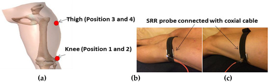 (a) The proposed sensor positions. (b,c) Implemented positions of SRR sensors on the two positions consisting of the distal femur and thigh.