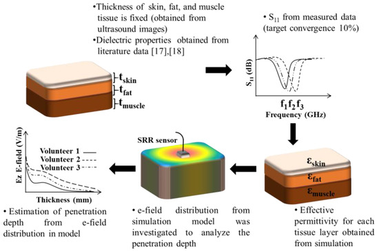 The proposed sensor was numerically simulated using Computer Simulation Technology (CST Studio, 2017, SIMULIA, Darmstadt, Germany) based on US tissue thickness measurements. Figure 3 shows the process of extracting the dielectric properties of different tissues and subsequent derivation of signal penetration depth using S11 data and US images. The thickness of tissue layers was fixed, the target S11 was obtained from measurement, and an initial estimate of dielectric properties was obtained from the literature. Then the dielectric properties were optimized to result in the simulated S11 that matches the target measured S11 obtained from volunteer measurement with a maximum convergence limit of 10%. The S11 data collected from the volunteers were imported into CST in the 1–3 GHz frequency range and were defined as the response of the model. The dielectric parameter of the CST model was optimized for the response thus defined.