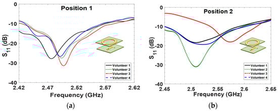 Measured S11 data versus frequency response for four volunteers from difference position measurements.