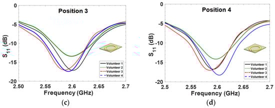 In this section, we present the results of S11 data measurements and their analysis. A general trend observed in the experiment is that the tissue thickness and position point influence the resonance frequency of the sensors. In Figure 4a–d, individual measurements from Positions 1 to 4 are presented. For calculations based on the shifted resonance frequency ∆fr, the highest frequency shift was obtained at Position 1, as shown in Figure 4a, for Volunteer 3 with 30.1 MHz. The lowest calculated ∆fr is at Position 4 for Volunteer 4 with 17.1 MHz. From these results, it is evident that the variation of tissue thickness at each position has an impact on the resonance frequency shift.