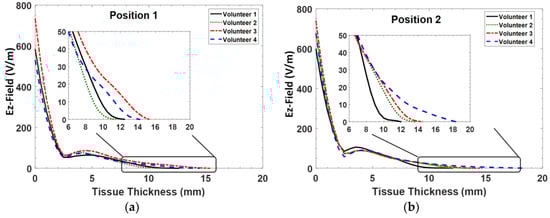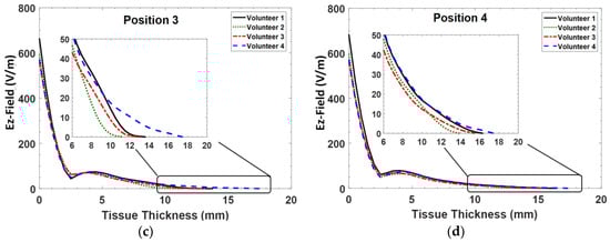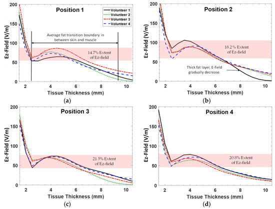 Moreover, there was lower E-field propagation at Positions 1 and 2 as shown in Figure 6a,b, respectively. Thus, the E-field propagation at Position 2 for Volunteer 1 decreased rapidly due to a small transition in between the fat and muscle boundary.