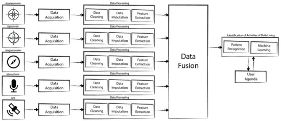 - Pires, I.M.; Garcia, N.M.; Pombo, N.; Flórez-Revuelta, F. From Data Acquisition to Data Fusion: A Comprehensive Review and a Roadmap for the Identification of Activities of Daily Living Using Mobile Devices. Sensors 2016, 16, 184. [Google Scholar] [CrossRef] [PubMed]