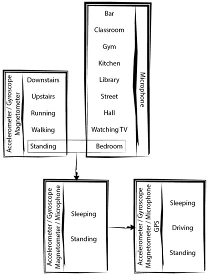 - Filios, G.; Nikoletseas, S.; Pavlopoulou, C.; Rapti, M.; Ziegler, S. Hierarchical Algorithm for Daily Activity Recognition via Smartphone Sensors. In Proceedings of the 2015 IEEE 2nd World Forum on Internet of Things (WF-IOT), Milan, Italy, 14–16 December 2015; pp. 381–386. [Google Scholar]