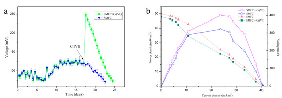 A combination of sterile water and 0.5 mg/L Cr(VI)-containing water was used in the SMFC. Non Cr(VI)-containing sterile water served as a control. 0–12 days was defined as the startup period. The voltage generation results showed that within 12–18 days, the generated voltage reached a maximum of 128 mV during the control operation, which indicated that the SMFC operated stably during this period. After 18 days of operation, a decrease of voltage was observed. Hence, as per the above observations, the total duration of 18 days was selected for subsequent experiments with water containing 0.5 mg/L Cr(VI), which is Chinese national standard regarded as the safe upper limit for the concentration of Cr(VI) in industrial wastewater. During the experiment with Cr(VI)-containing water added to the cathode in stably period, the voltage of SMFC reached 248 mV quickly and a sharp decrease in voltage was obtained (Figure 3a). The analysis of the power density and polarization curves of SMFC and SMFC with Cr(VI) was done at varying external resistances to evaluate its performance (Figure 3b).