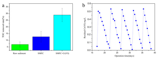 Total organic carbon removal rate of organic substrates in the anode under the optimal operation conditions with different operation (Raw sediment, SMFC and SMFC with 0.5 mg/L Cr(VI)) (a). (b) Residual concentrations of Cr(VI) in the wastewater of the cathode over five cycles.