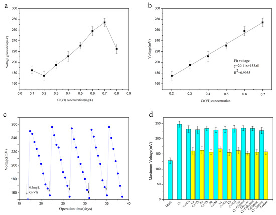 When the Cr(VI) concentration was further concentrated to 0.8 mg/L, the power output decreased and when the concentration of Cr(VI) was set as 0.1 mg/L, this linear relationship was also not consistent. Therefore, 0.2 mg/L concentration was considered the lower detection limit and 0.7 mg/L was observed to be the upper detection limit for the biosensor. The detectable Cr(VI) concentration range is thus around 0.2 to 0.7 mg/L, which the discharge must be below 0.5 mg/L based on the Chinese National Standard, which is included in this range, so the signals of our system can be utilized for monitoring the Cr(VI) concentration in wastewater. The performance characteristics of the SMFC were obtained under the optimal working conditions. The evaluation of the stability of this biosensor was done by using 0.5 mg/L Cr(VI) to test the performance of the SMFC over five cycles. From the results (Figure 5c) it was observed that the system had a stable voltage output with good repeatability. The maximum voltage from the five cycles was 249 ± 2.62 mV, the average response time of each cycle was 18.31 ± 0.25 min, and the average recovery time was 6.42 ± 0.36 h in each cycle. To investigate the accuracy of the system, sterile wastewater samples were obtained from a chemical industrial plant without Cr(VI) and washed thrice with phosphate buffer. Different heavy metals, including Cu2+, Zn2+, and Pb2+, etc., which were at the same concentration (0.5 mg/L) as Cr(VI) and some organic compounds were added to the cathode along with 0.5 mg/L Cr(VI) to evaluate the accuracy of the SMFC system and the maximum voltage generation in the presence of the various additives was 266 ± 0.26 mV, which showed not influenced by other factors Furthermore, the addition of different heavy metals at the same concentration as Cr(VI) into the cathode alone without Cr(VI) were also investigated, and the results also demonstrated that there was no effect on the voltage generation of system (Figure 5d), which is similar to the result obtained when 0.5 mg/L Cr(VI) alone was present. A stable performance of the system was obtained, which proved that the SMFC-based biosensor has high potential for Cr(VI) measurement in industrial wastewaters.