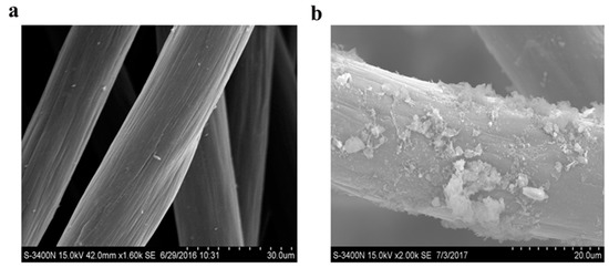 Scanning electron microscopy and cyclic voltammetry analysis were used to assess the electrochemical activity. The bacterial cells are attached and fixed on the surface of the anode, as a biocatalyst, which can degrade the substrate and generate the current [42]. The surface of the anode (carbon fiber) before and after treating actual wastewater was visualized by a Scanning Electron Microscope (SEM, JXA-840A, JEOL, Tokyo, Japan) to determine the microbial attachment and formation of a biofilm on the anode electrode surface. The SEM results showed the surface of the electrodes was covered with the biofilms containing electrochemically active bacteria (EAB) (Figure 6a). It was observed that the anode had a rough and porous surface due to the attachment of the microbes, thereby helping to improve the direct electron transfer in the SMFC, whereas the control anode without microbes had a smooth and clean surface (Figure 6b). This would explain the differences in electricity output.