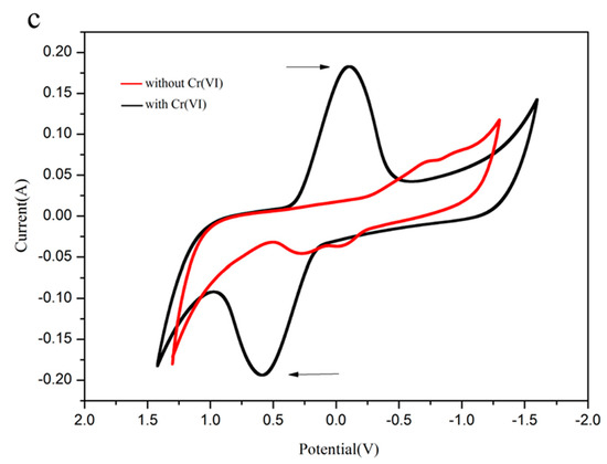 The extracellular electron transfer (EET) mechanism is strongly dependent on the redox activity in the SMFC system and is required to generate electrical conductivity in the biofilm and electrode due to the fact the biofilm conductivity itself is not great enough to transfer electrons fluently to/from the electrodes [43]. To reveal the underlying mechanism of EET, cyclic voltammetry (CV) was used at a scan rate of 0.025 V/s. There were no apparent oxidation-reduction peaks in the control group (without Cr(VI)). According to the CV curve results, a pair of oxidation/reduction peaks were achieved with the cathode solution with Cr(VI) at −111 mV and 581 mV, respectively (Figure 6c), proving the importance of biofilms responsible for the electrochemically catalytic activities. The diffusion process is a rate-limiting step of the shuttle-mediated EET. The Cr(VI) concentration could finally enhance the electron shuttle-mediated EET. These results demonstrated that cathode solution with Cr(VI) showed higher redox potential than without Cr(VI).