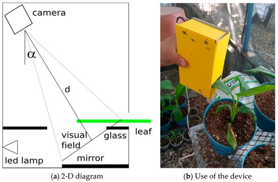 The camera sensor was a Sony ICX204 with dimensions of 5.8 × 4.92 mm2, and the lens used had an 8 mm focal length. The image acquisition device used a MCWHD2 led lamp (800 mW) as the light source. The nominal wavelength spectrum was 400–700 nm, and the maximum irradiance measured at a distance of 200 mm was about 121 µmol m−2s−1. In addition, the optical arrangement used a 50 × 70 mm2 glass that held the leaf to be analyzed. Finally, at the bottom, a 70 mm square mirror reflected the leaf reflectance information. Black-matte plastic pieces were used to control the light flow inside the device and reduce the entry of external light, which would otherwise induce measurement errors. The camera was placed at a 39° horizontal inclination (to observe simultaneously both the upper and lower part of the leaf), with a 100 mm vertical distance and a horizontal gap of 20 mm with respect to the glass in the center. The viewing angle—which determines the longitude of the visual field as a function of the distance between the camera and the glass where the leaf is placed—is calculated by using Equation (4), where α is the vertical or horizontal viewing angle, s is the vertical or horizontal dimension, and f is the focal distance. Using this configuration, both the glass and the mirror could be observed. As a result, the bisector d (Figure 1) represents the necessary distance between the vision field and the camera, and is calculated by Equation (5), where d is the bisector and l is the visual field longitude. The camera was focused on the visual field line, and the diaphragm opening was adjusted to f = f/8. Finally, to acquire the images, a small part (about 2 cm) of the lettuce leaves were inserted in the optical system and the images were acquired in RAW format, as shown in Figure 2.