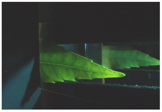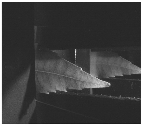 As can be observed in Figure 2, the obtained image shows both the adaxial leaf side in the left part of the image and the abaxial leaf side in the right part of the image. The left part of the image produces the transmittance information, while the right part yields the reflectance information. The shape of both leaf sides is not similar due to the perspective distortion. A non-flat leaf must be placed between two glasses to help introduce the leaf in the device.