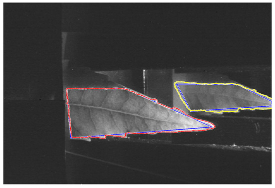To separate the leaf from the background a method based on active contours has been used [35]. In Figure 4, the results of the binarization are shown. The blue line specifies the initial state of the active contour and the boundaries of the object are indicated in red and yellow color.