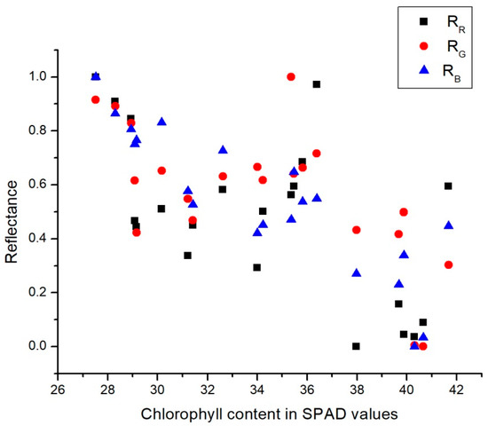 MATLAB 2015b was used to perform all image processing steps and the linear regression. Figure 5 and Figure 6 present the chlorophyll contents in SPAD values in relation with the average values for transmittance and reflectance values for each of the R, G, and B channels.