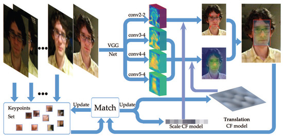 Figure 1 shows an overall flow of the proposed ACMD (Adaptive Correlation model for visual tracking using keypoints Matching and Deep convolutional feature) tracker. An input image of the t-th frame is first pre-processed to fit the network input. Then, the conv2-2, conv3-4, conv4-4, and conv5-4 layers of VGG-19 [24] are used as feature extractors. These features are then convolved with two learned CF models to provide translation estimation and scale estimation. Final estimation of the t-th frame is achieved by the combination of two CF models’ output. A dense matching is then employed between current frame and previous frame and the matching score is used to update the keypoints set and discount the learning rate.