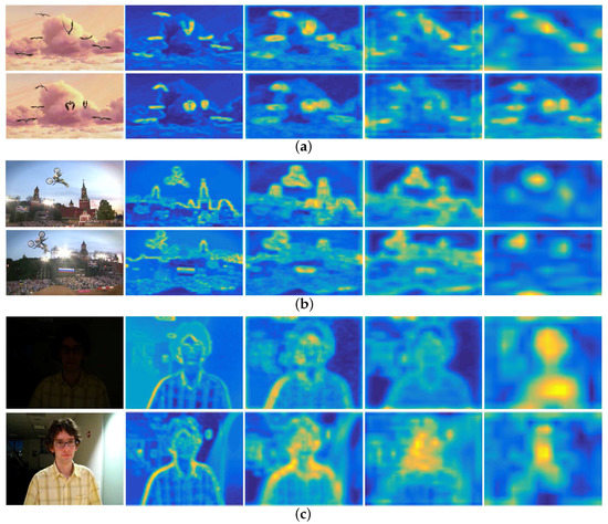 Figure 2. Visualization of input and outputs of different layers. From left to right are the input frame, feature maps of conv2-2, feature maps of conv3-4, feature maps of conv4-4, and feature maps of conv5-4. (a) Bird1; (b) MotorRolling; (c) David. - Feature maps of lower layers retain more spatial details of the target, such as borders, corners, and curves. Taking David as an example, it is obvious that the texture of the face such as edges and contours are well preserved, including the corner of the ear, the boundary of the face, etc., which could be used to determine the boundary of the target and thus to make scale estimation.