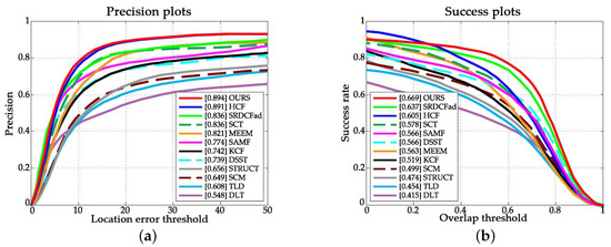 Precision and success plots over the OTB-2015 dataset. (a) Precision plot; (b) Success plots.
