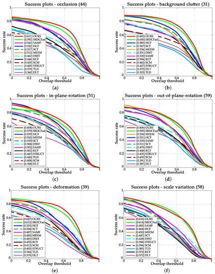 Success plots over six tracking challenges of (a) occlusion; (b) background clutter; (c) in-plane rotation; (d) out-of-plane; (e) deformation; and (f) motion blur.