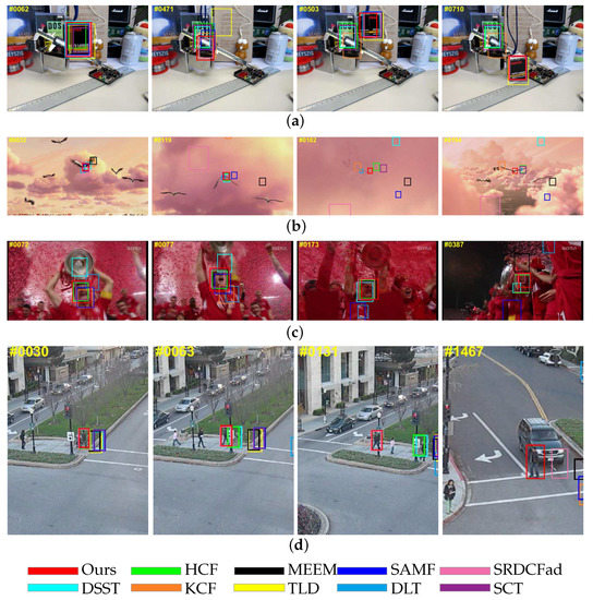 In this section, we focus on the trackers’ performance against background information variation, including occlusion and background cluster. Figure 6 shows the situation in which the target undergoes severe occlusion and background cluster. In the sequence box and Bird1, the occlusion takes up to 35 frames and 50 frames, respectively. In the sequence Human3, the target is occluded by two different objects. In the sequence Soccer, spatial context information of the target changes dramatically and the target is nearly fully occluded. Due to the proposed updating method, the discounting factor decreases to near zero when the target undergoes occlusion, which prevents the correlation filter from learning occlusion information and losing the ability to discriminate the target. It should be noted that in the sequence Human3, only our tracker and SRDCFad succeeded in tracking the target at the first 1400 frames, which means that an adaptive model updating method is significant when the occlusion situation is complex. Besides, semantic information encoded in higher layers ensures that the tracker is not sensitive to background cluster.