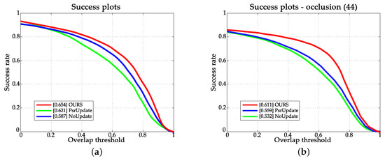 Tracking performance of different updating methods. (a) Success plots on OTB-2015; (b) Success plots over sequences with occlusion attribute.