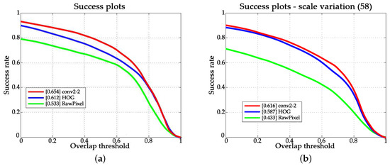 Scale estimation performance using different features. (a) Success plots on OTB-2015; (b) Success plots over sequences with the attribute of scale variation.
