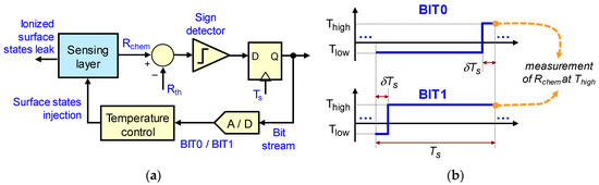 (a) First-order sigma-delta modulator topology to control the chemical resistance of the metal-oxide sensing layer. At each sampling time TS, depending on whether the chemical resistance Rchem, measured at the reference temperature Thigh, is below (or above) the desired value Rth, a BIT1 (or BIT0) temperature waveform is applied to the sensor during the next sampling period; (b) parameters of the BIT0 and BIT1 waveforms.