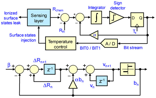 This control replicates the usual circuit topology of a 1st order sigma-delta modulator. The sensing layer can be seen as a reservoir of ionized surface states, which can be negatively or positively charged. In an oxidizing atmosphere, increasing (decreasing) the average temperature will increase (decrease) the adsorption of gas molecules that, when ionized, will increase (decrease) the total negative ionized surface states. In this case, the average temperature generated by the control must be able to keep constant the interchange of ionized surface states with the surrounding atmosphere by applying a suitable sequence of temperature waveforms. Changes in the atmosphere are therefore compensated for by changes in the average temperature generated by the control.